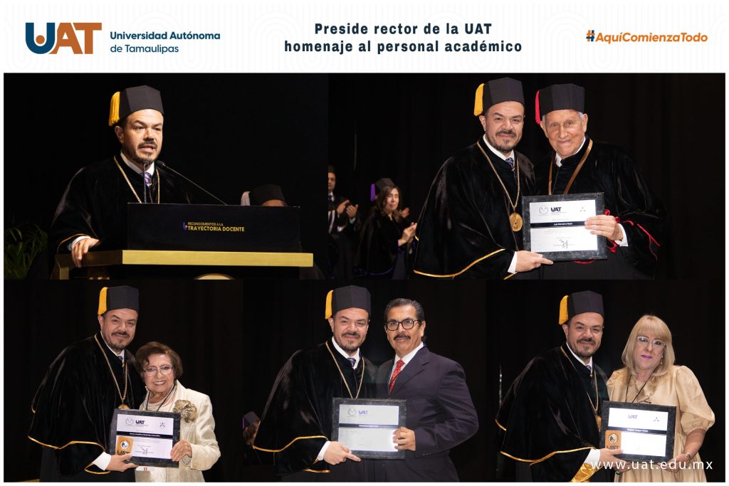 El rector de la Universidad Autónoma de Tamaulipas (UAT), Guillermo Mendoza Cavazos, presidió en esta capital la ceremonia de Reconocimiento a la Trayectoria Docente, en cuyo marco entregó diplomas, estímulos económicos y medallas conmemorativas al personal académico de las zonas norte y centro del estado por su labor al servicio de la casa de estudios.