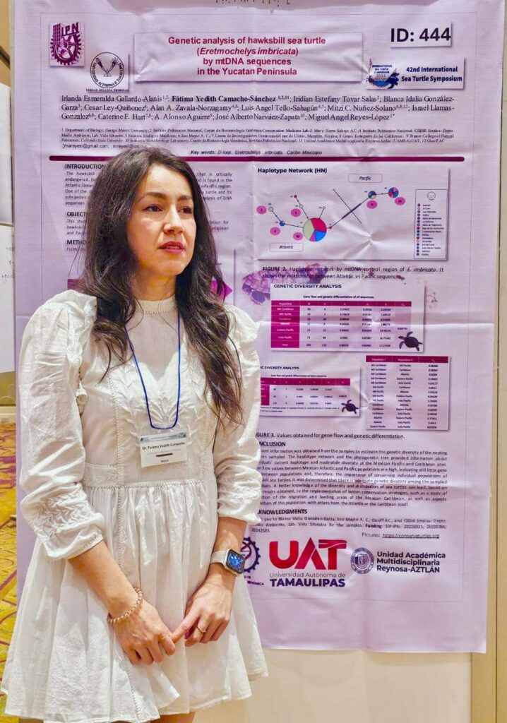 La Dra. Fátima Camacho Sánchez, profesora e investigadora de la Universidad Autónoma de Tamaulipas (UAT), destacó a nivel mundial al presentar en el 42 Simposio Internacional de Tortugas Marinas en Pattaya, Tailandia, su estudio titulado “Análisis genético de la tortuga carey (Eretmochelys imbricata) mediante secuencias de ADN mitocondrial en la península de Yucatán».